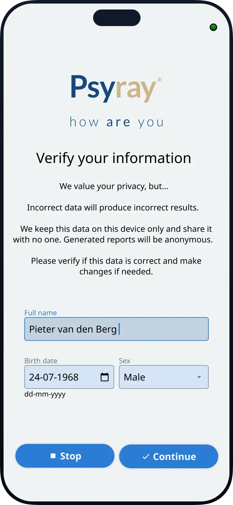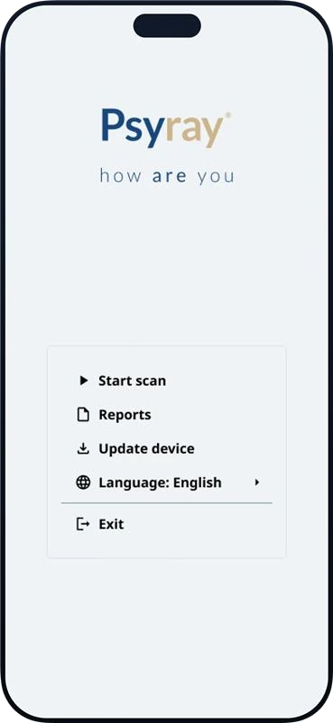 The Psyray app, in combination with the Psyray Pro One device, ensures a quick and robust scan process. Just select your desired report in your own app, and this will trigger the Psyray app to begin the scan process, ensuring the validity of the data and its integration with the Psyray engine.