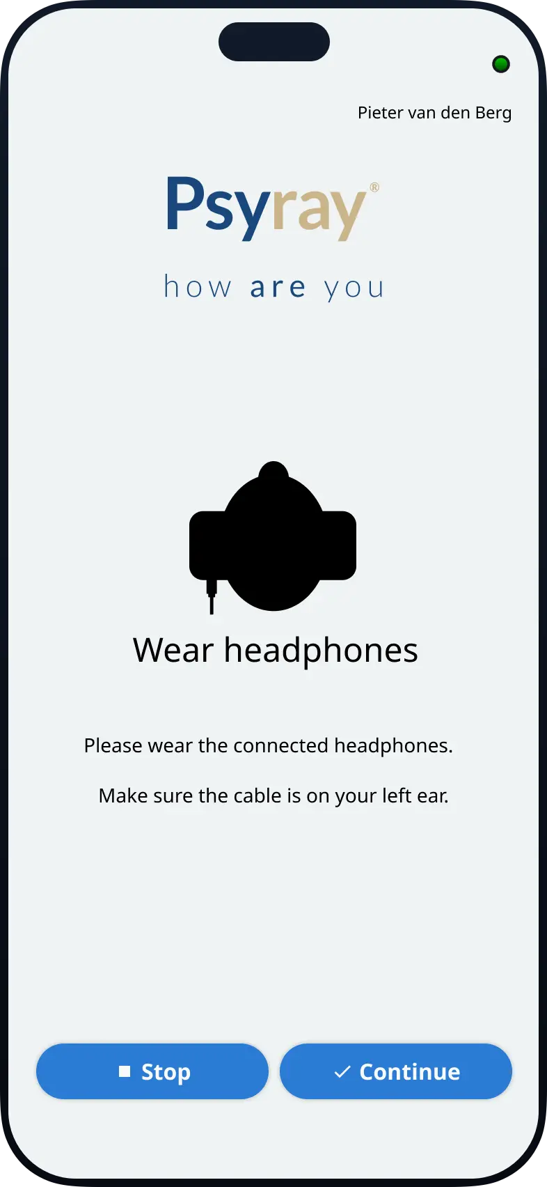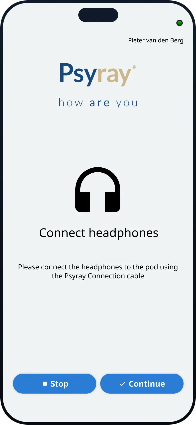 The Psyray Pro One device uses unique brainwave technology fitted inside a small circular disc, the pod, which plugs into a special headphone. The Psyray app is guiding the user through the scan process and will send the captured data to our secure engine for processing and analysis.
