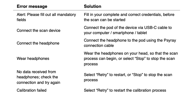Potential errors are communicated via your Psyray App’s messages, including clear instructions on resolving the issue in question. See the table below for the complete overview of all error messages: